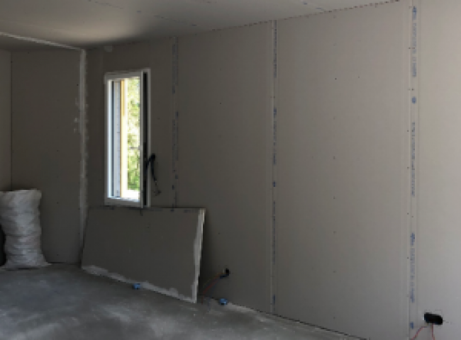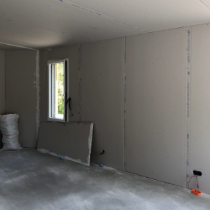 Création d'une extension d'un salon et d'une chambre avec pose d'une cloison iso phonique de 16 cm d'épaisseur pour la séparation entre le salon et la chambre aux normes RT2012, on utilise également une laine acoustique de 70mm.
